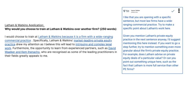 - You get comments fully tailored to the law firm you’re applying to and feedback we’ve received about what they care about, the structure they look for, and the qualities they assess.
